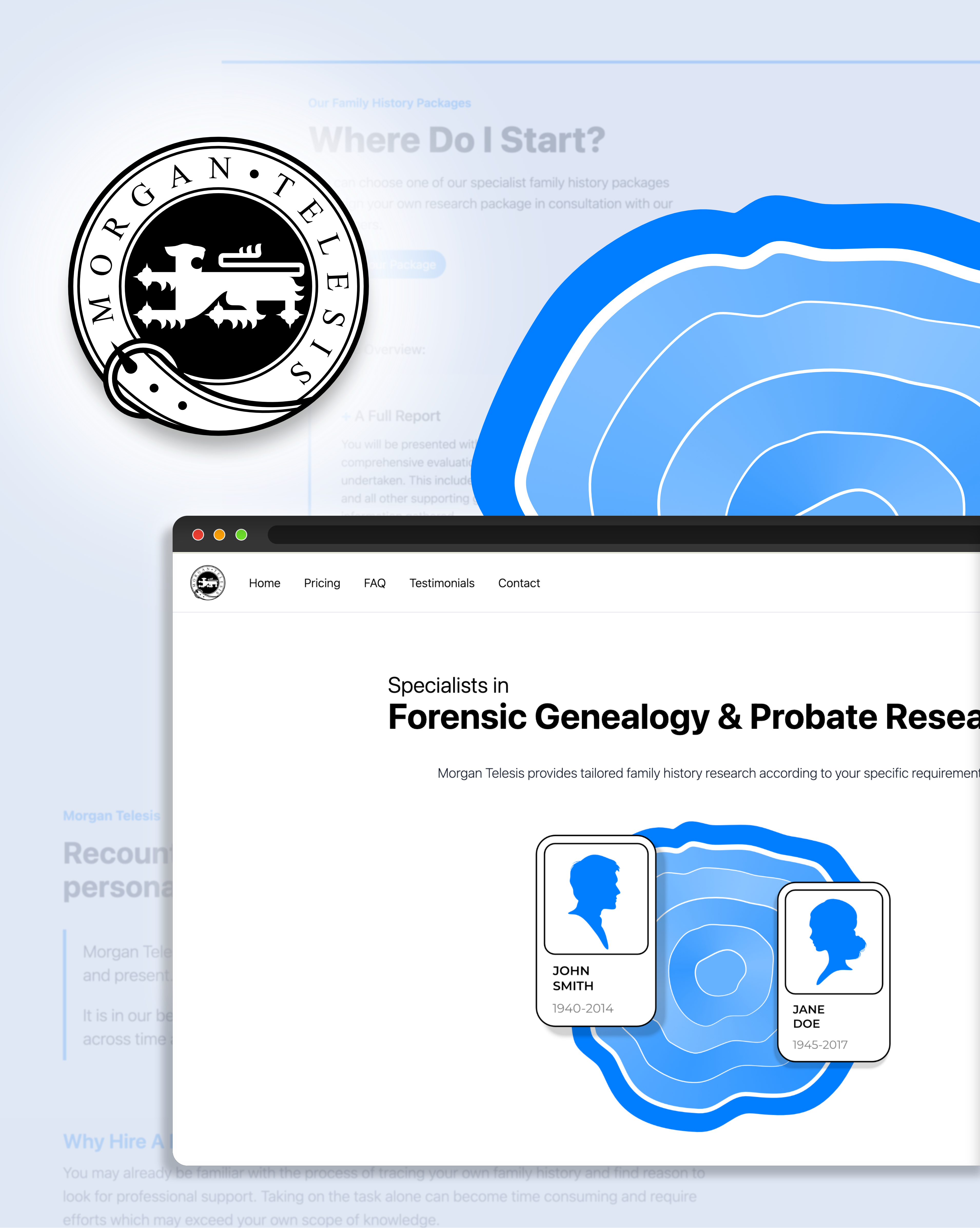 Full brand strategy and website design for a forensic genealogy and probate research business. The project included visual identity development, UX/UI design, and custom web development.
